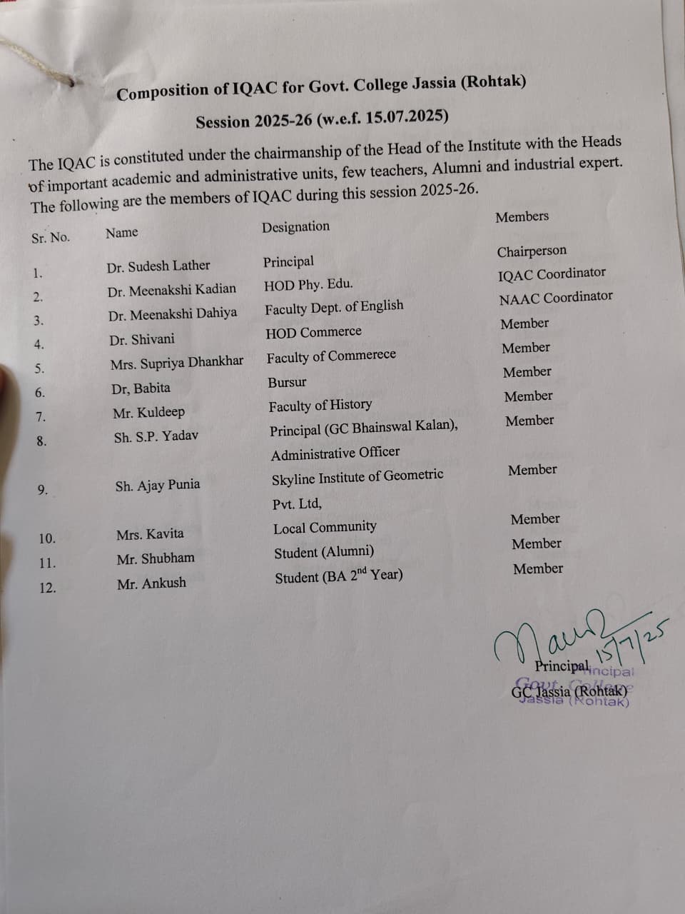 of IQAC for Govt. College Jassia (Rohtak)